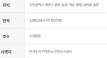 3기 신도시 분양 중에 인천광역시 있는 분양 호수는 17,000호로 인천광역시 계양구 굴현, 동양, 박촌, 병방, 상야동 일원을 말합니다. 분양 면적은 101만평이라고하며 한국토지주택공사와 인천도시공가사 시행자입니다.