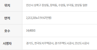 안산시 상록구 장상동, 장하동, 수암동, 부곡동, 양상동 일원 위치해 있으며 분양 면적은 67만평으로 호수는 14,400호입니다. 시행자는 마찬학지로 경기주택도시공사, 안산도시공사 그리고 경기도와 LH가 있습니다.