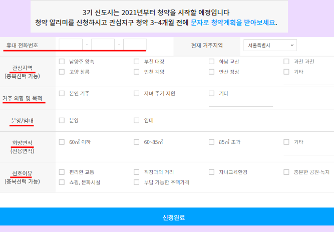 3기 신도시 청약일정 알림 문자 SNS 신청을 하실때, 청약일정과 분양 계획을 알림받을 전화번호를 적으시면 분양계획일정을 알려줍니다.