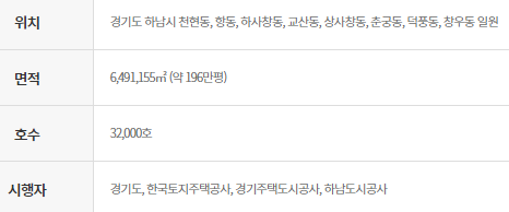 경기도 하남시의 3기 신도시 분양 면적은 196만평으로 32,000호 세대를 예상합니다.