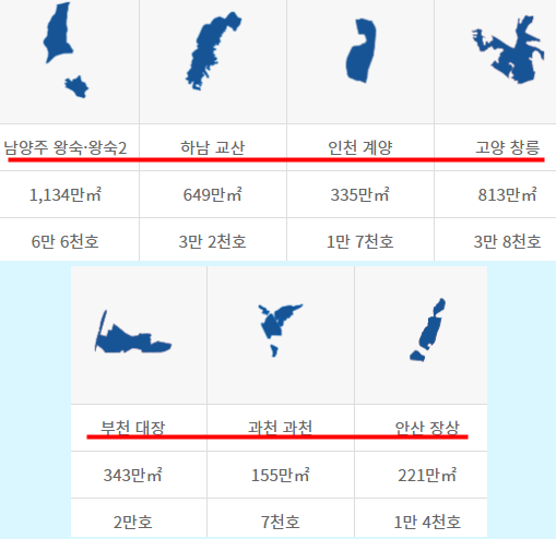 각 3기 신도시 지역별 분양 위치와 면적, 호수