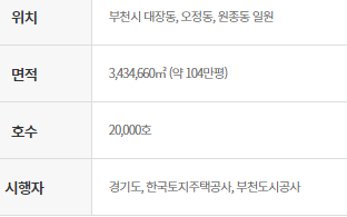 부선시에 위치한 3기 신도시로 대장동, 오정동, 원종동 일원을 말하며 분양 면적은 약 104만평으로 100만평이 넘습니다. 또한 호수는 20,000만호로 많은 주거제공 분양이 있을 예정입니다. 경기도와 부천도시공사 그리고 한구토지주택공사 등이 시행자로 참여합니다.