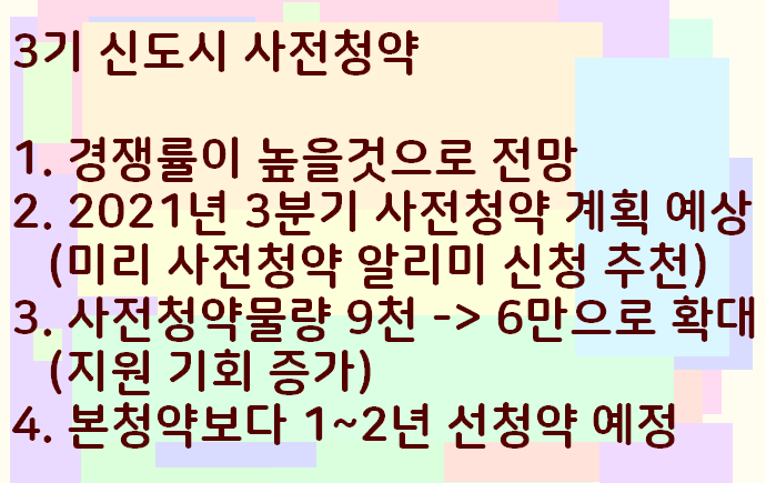 사전청약이란 본청약보다 1년, 2년 앞서서 미리 청약 신청을 받는 것으로 정확한 일정은 확정되지 않았으나 2021년 3분기쯤에 3기 신도시 사전청약을 받는다고 알려져있습니다.