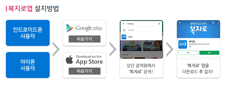 구글 플레이스토어와 아이폰 애플 앱 스토어에서 다 복지로를 다운 받응셔서 설치하시면 됩니다.