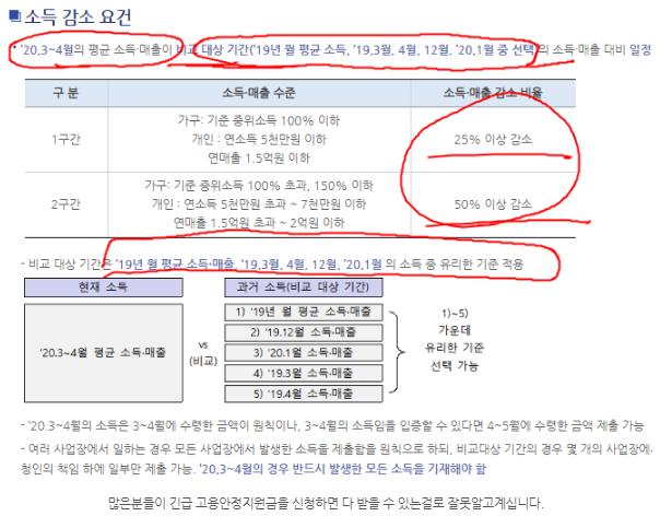 2020년 3월 4월 평균 소득매출이 2019년 월 평균소득이나 3월, 4월, 12월 또는 2020년 1월 소득중 한곳과 비교해서 매출이 25% ~50% 이상이 감소해야한다고 나와있습니다.