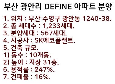 이렇게 부산 광안리 DEFINE 광안동 아파트 분양정보를 정리했는데요.