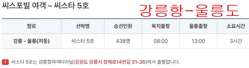 강릉에서 울릉도에가는 씨스타 5호는 총 438명이 탈수있는배로 185km를 운행하여 울릉도 저동항에 도착합니다.