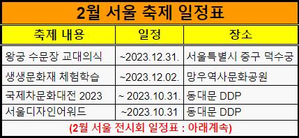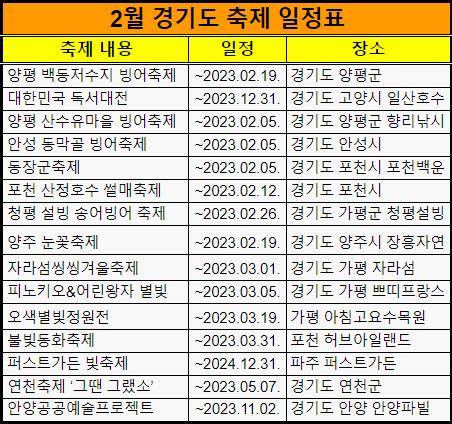 이렇게 2월에 서울과 경기도에 축제 일정을 표로 정리해서 알려드렸는데요.