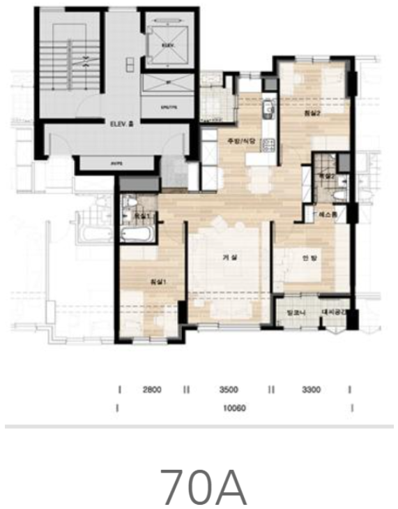 가장 작은 평수이지만 방이 3개입니다. 화장실도 2개이며 있을건 다 있습니다. 발코니도 있고 신혼부부가 살기에 작지는 않을듯합니다.