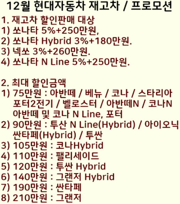 12월 현대에서 할인하는 재고차는 쏘나타(하이브리드 포함), 넥쏘, 쏘나타N LIne이 있습니다.