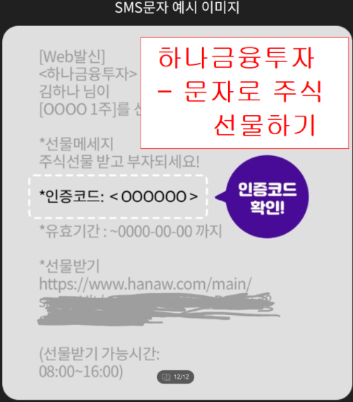 이 방법은 상대가 하나금융투자 어플이나 계좌가 없어서 문자로 주식 선물하기가 가능합니다.