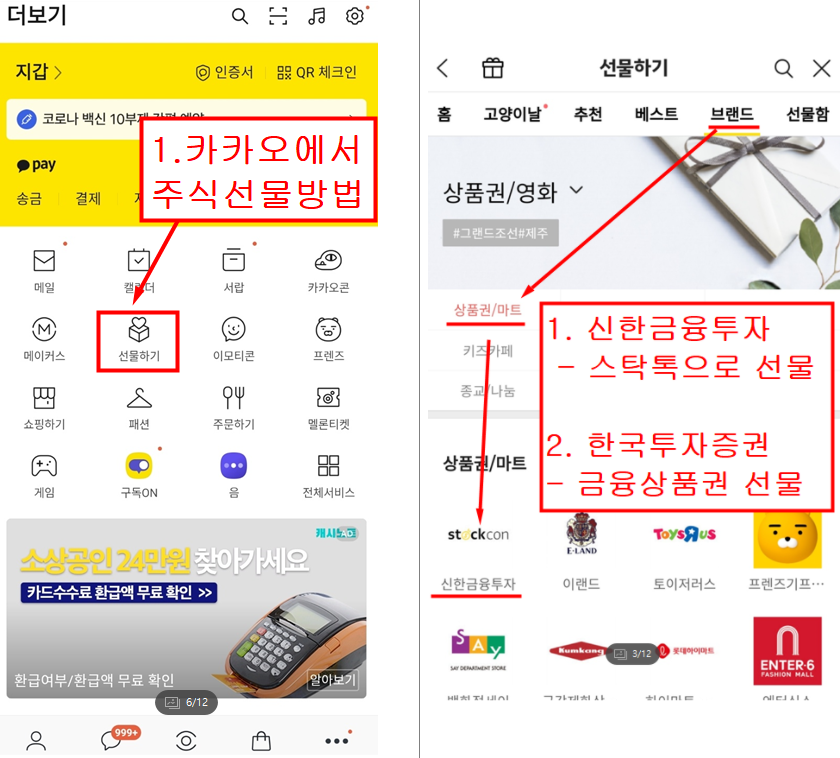 그 선물주식이나 국내선물상품과는 다르게 이 포스팅에서 말씀드린 '선물'의 개념은 진짜로 코스닥이나 코스피에 상장된 주식을 사서 선물하는 내용입니다.