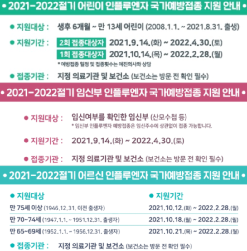 인플루엔자 백신 무료 접종대상자별로 신청기간이 다릅니다.