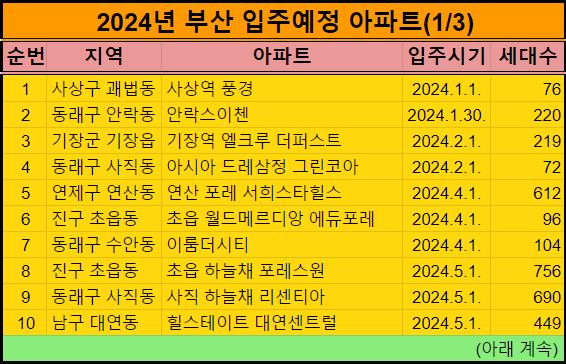 2024년 부산에 입주하는 아파트 36곳을 표로 정리했습니다.