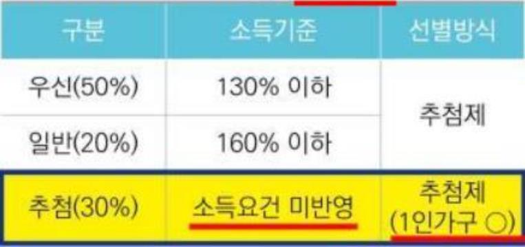 네번째. 추첨제가 아닌경우 소득조건 160%이하이어야힙니다.