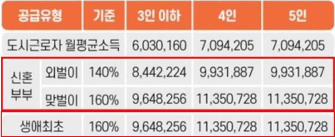 추첨이 아닌 생애최초 혹은 신혼부부 특별공급을 신청하실분들은 160% 기준표를 참고하세요.
