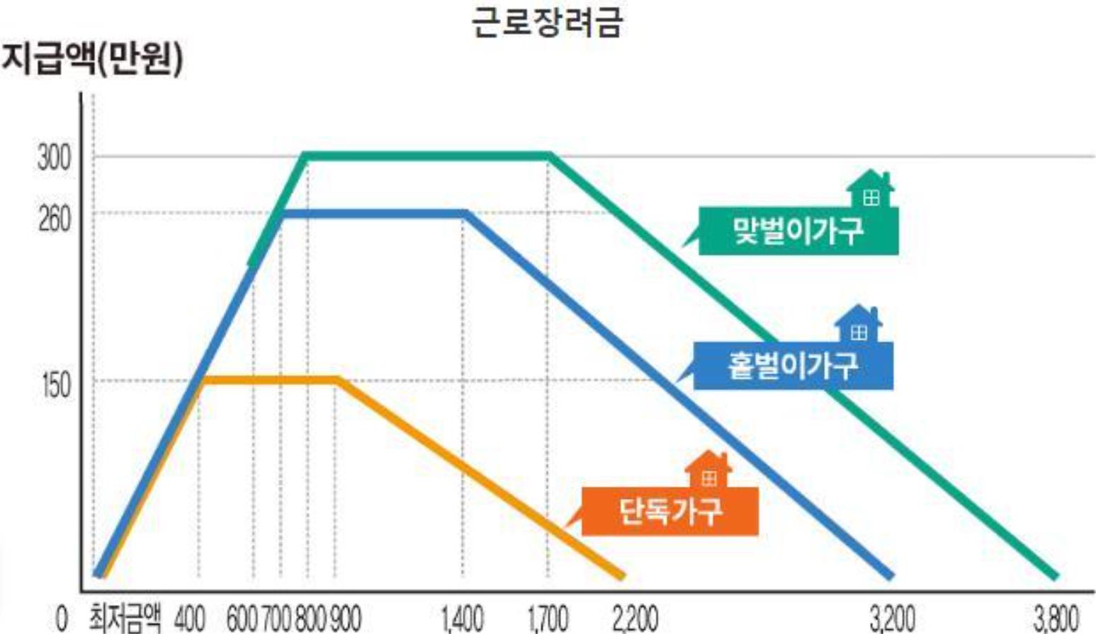 홀벌이가구는 최대 250만원, 맞벌이는 최대 300만원의 근로장려금을 지급합니다.