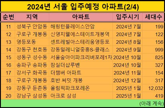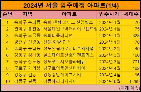 서울시에 2024년에 입주하는 아파트를 표로 확인하시기 바랍니다.