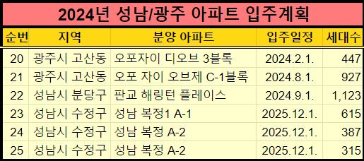또한 2024년 용인시와 성남시 입주예정 아팥프도 같이 정리해놨습니다.