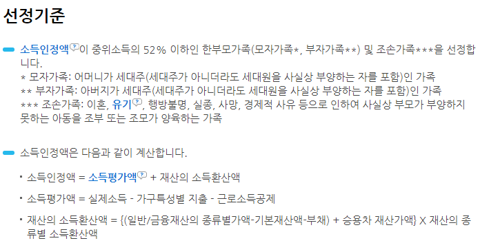 한부모가족 아동양육비 지원금 선정 기준은 중위소득 52% 이하의 한부모가족 또는 조선 가정 손자손녀이어야 합니다.