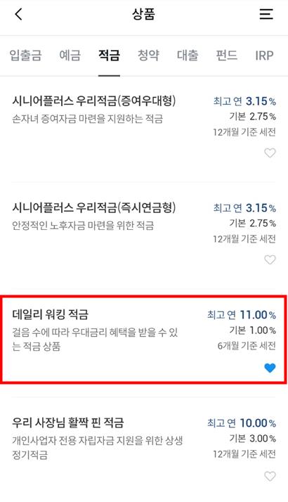 다섯번째. 걸음수에 따라 우대금리 혜택을 받을수있는 적금이로 최대 11%입니다.