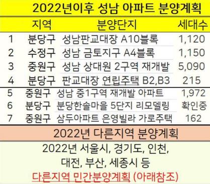 아래 2022년 성남시를 포함한 경기도, 서울, 인천 아파트 분양계획을 정리했습니다.