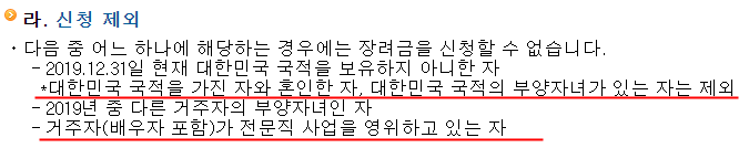 한가지 참고로 말씀드리면 외국인이라 하더라도, 대한민국 국적의 배우자와 결혼한 자나 한국인 부양자녀가 있는자는 제외되서 신청 자격이 충족될수도 있으니 참고하시기 바랍니다.