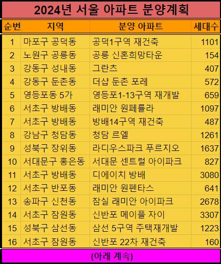 2024년 서울 아파트 분양계획을 표로 정리했습니다.