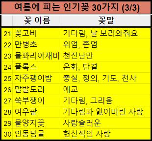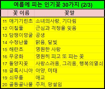 여름꽃 종류별로 이름, 꽃말을 옆에 적어놨습니다.