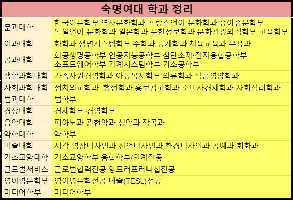 숙명여대 학부별로 학과도 표로 정리해놨으니 참고하세요.