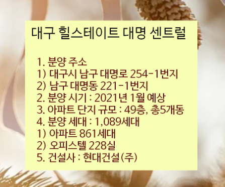 이렇게 대구시 남구에 위차한 힐스테이트 대명 센트럴 아파트 분양 정보를 요약해드렸습니다.