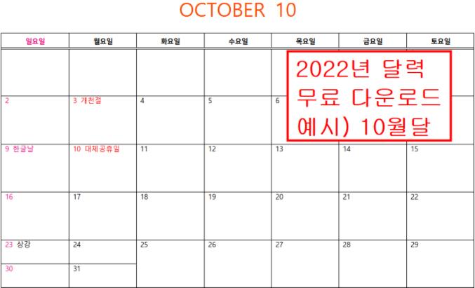 위에 2022년 달력을 PDF파일로 남겨놨으니 무료로 받아서 유용하게 사용하세요.