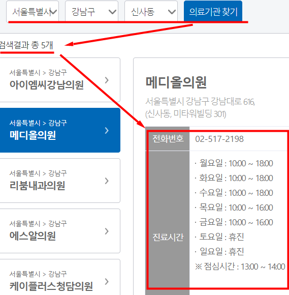 병원 주소, 휴무일, 전화번호까지 조회가능합니다.
