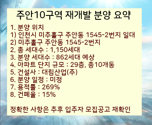 이상으로 주안10구역 재개발 분양 아파트를 알려드렸습니다. 미추홀구 주안동에 1545-2번지 일대에 분양할 예정이며, 위에 포스팅에서 간략하게 핵심사항들만 잘 정리해드렸습니다. 청약을 지원하려는 무주택자분들에게 많은 도움이 되었으면 좋겠습니다.