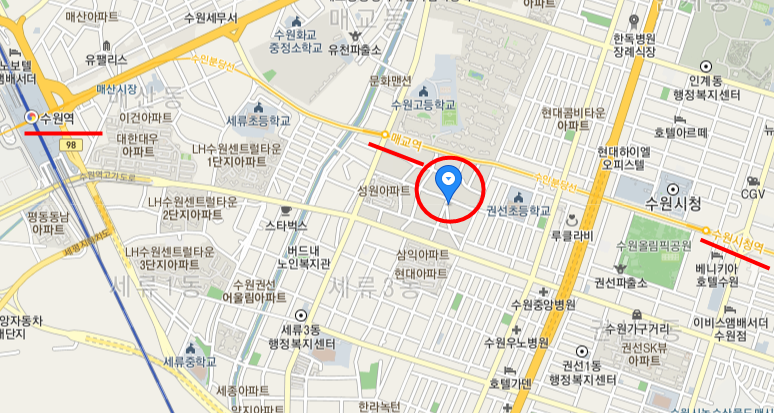 수원 권선6구역은 경기도 수원시 권선구 세지로125번길 9-15일대에 위차한 지역이며, 아래 지도에서 보듯이 수원역과 가까이 있으면서 동시에 매교역 역세권에 위치해있어서 지리적으로 직장인분들에게도 좋다고 생각됩니다. 수원고등학교와 권선초등학교, 세류 초,중학교가 있어서 교육인프라가 잘 갖춰져있으며 수원시청이 가까이 있어서 행정업무를 보시기에도 좋다고 생각합니다.