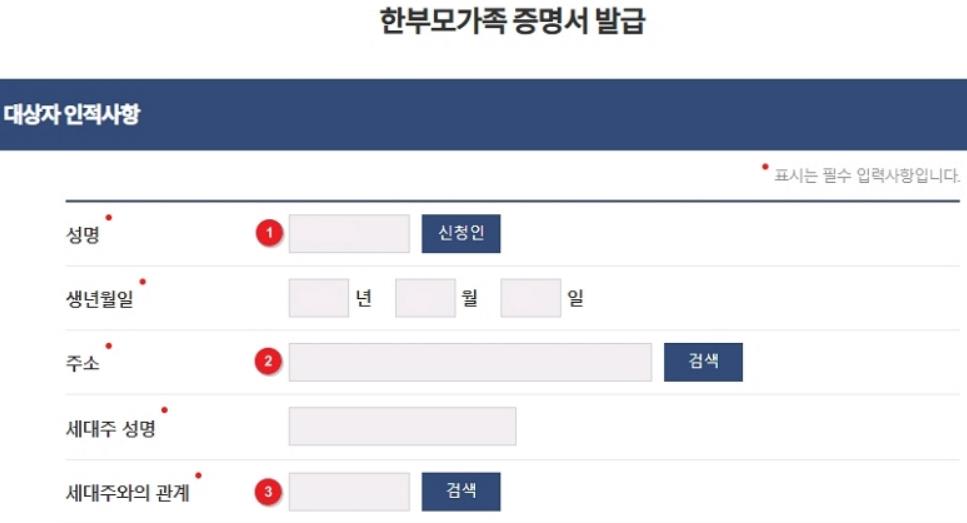 1. 성명, 생년월일, 주소, 세대주 성명 및 관계를 입력합니다.