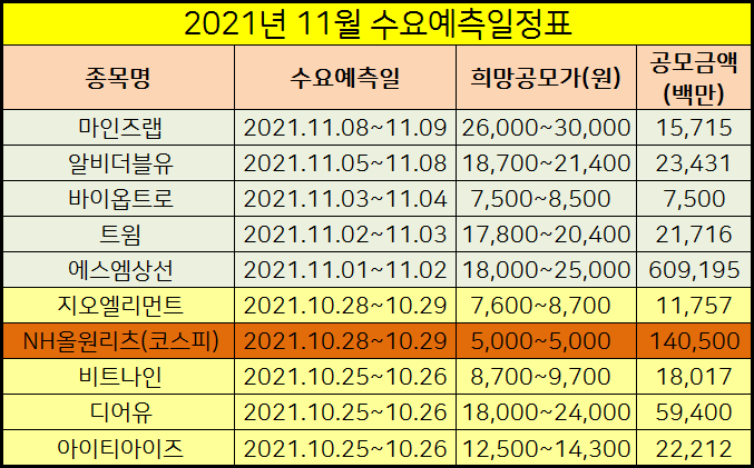 2021년 11월에 신규상장 예정인 주식들을 표로 정리하였습니다.