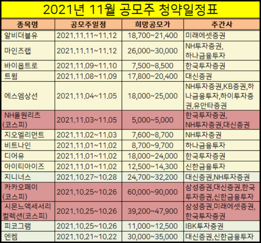 오늘은 이렇게 2021년 11월 공모주 청약일정을 표로 정리해서 알려드렸습니다.