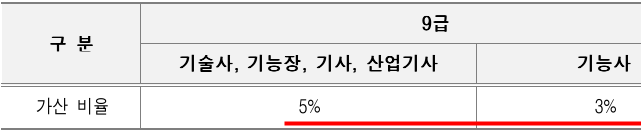 기술사와 기능장, 기사, 산업기사는 5%의 가산점이 있습니다.