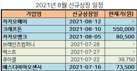 그리고 7월 신규상장 상장 예정일도 표로 정리하였습니다.