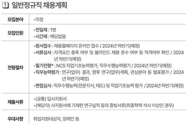 - 서류심사 : 자격요건 충족 여부 및 블라인드 채용 준수 여부 등 적격여부 확인 / 2024년 하반기(예정).