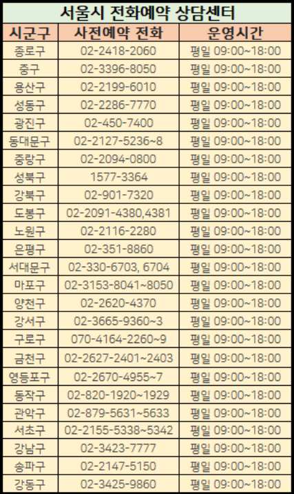 서울시에는 각 구별로 사전예약 상담센터를 운영하고 있습니다.
