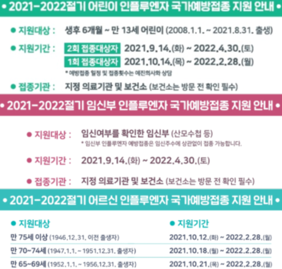 위에 말씀드렸다싶이 2021-2022절기 인플루엔자 국가예방접종 지원사업 기간내에 신청하시면 됩니다.