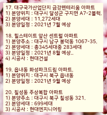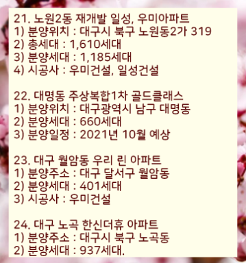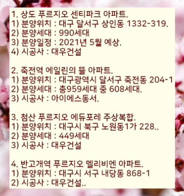 이렇게 2021년 대구에서 분양하는 아파트 목록을 정리하였습니다.